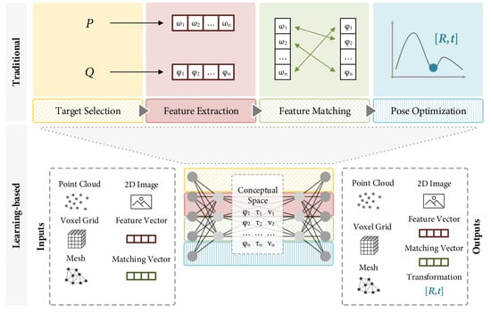 Vertically, the schematic is divided at the top with the traditional stages clearly defined and at the bottom the learning-based approaches that are reviewed here, represented by a neural network, and the possible data for inputs and outputs. Having in mind this information, the inputs for the learning-based proposal could be in different formats, such as point clouds, voxel grids, meshes, etc. In addition to full end-to-end approaches, some methods accept as inputs the result of the Feature Extraction or Matching stages in the traditional pipeline. The output could be some data in a specific format as well as the result of the stages from the traditional pipeline (feature vector, matching vector, and transformation). Nevertheless, with the new learning-based approaches, a new conceptual kind of space appears, containing learned properties about the object, materials, and their behavior that can be registered with the input data (e.g., aligning input data of an inflated ball with its deflated state restricted by the physical behavior of the object, rather than aligning with a final deflated target). The conceptual space is modeled by a neural network and its training process, and, theoretically, it could be considered as an input to the registration process, but it is not an input that one might use in every registration instance since it is an internal representation. This allows the network to encode conceptual models such as physical phenomena (e.g., force vector and symbolic/conceptual information such as “sporty, comfy”) or mathematical rules. Besides, the neural network could perform one or more phases from the traditional pipeline (represented by the colored rectangles (see Figure 1) shown in the network). Considering all of this, we can see that there are multiple possibilities, combining inputs from different stages and outputs from the learning-based approaches.