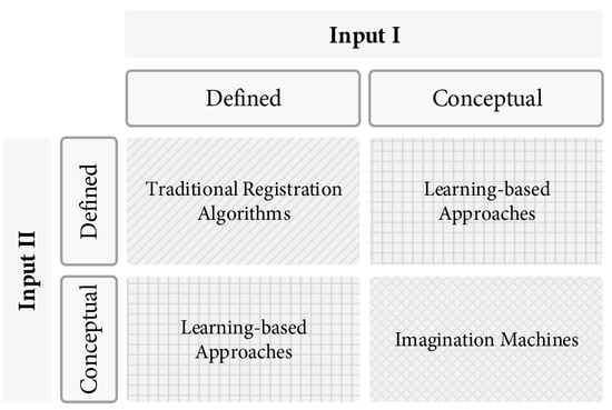 The conceptual models have also been applied in registration, for example, in the work of Yumer and Mitra [12], in which the network learns properties of objects, being able to know what a more sporty car looks like or a more comfortable chair is, and modifying a 3D model to fit those properties while preserving the main features of the original data. With this approach, three combinations of input information are possible: defined model/defined model, defined model/conceptual model, and conceptual model/conceptual model. This taxonomy is shown in Figure 3. The classical algorithms for registration are included in the first of the possibilities, one input is used as a target or as a reference set whilst the other is transformed to be aligned with the first, but always with defined data. By contrast, the use of neural networks for registration results in other combinations where conceptual models are included. Those models need not be specifically defined, e.g., they can be synthesized by a trained network with the learned features coming from the training data. Then, these features can be used in the registration process afterward or even in the same network. In any case, there is no need to understand the working space of the network. Its internal representation is alien to human knowledge.