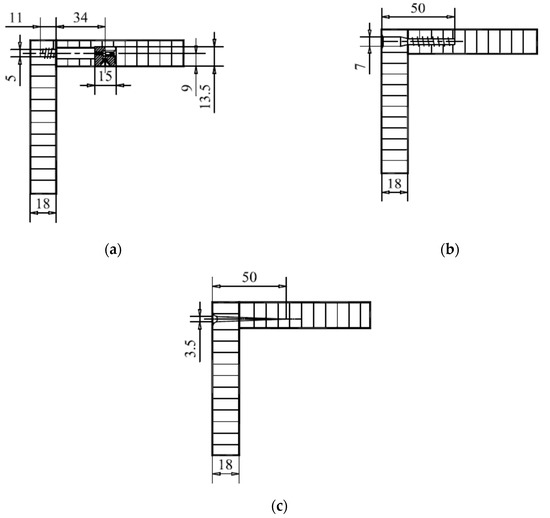 Figure 3. Types of joints: (a) Minifix, (b) one-piece connector Confirmat ø7 × 50 mm and (c) screw for wood ø3.5 × 50 mm.