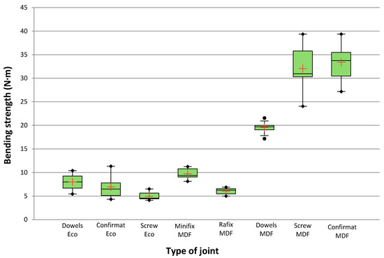 The results of the bending strength are given in Table 2 and the boxplot graphic in Figure 5. The performance of the joints made of the eco-friendly composites with a Minifix connector was unsatisfactory. In practice, they cannot be used as connecting elements due to the fact that the bolt of Minifix reacts with a limited part of the panel and the pullout strength of this part of the connector is significantly less. The rest of the tested joints showed sufficient bending capacity. The highest bending capacity was demonstrated by the joints with 8 × 30 mm dowels (8.02 N·m), followed by the Confirmat ø7 × 50 mm (6.95 N·m) and screws for wood ø3.5 × 50 mm (4.94 N·m). According to Tukey’s test, a significant difference was observed only between the screw joints and the group of dowels and the Confirmat joints. The low strength of the joint with wood screws was due to the inhomogeneity of the eco-friendly panels fabricated from residual wood fibres. In contrast, the corner joints made from MDF panels exhibited an almost equal strength to the joints with the Confirmat and screws due to the homogeneity of the panels. This is proof that the small diameter of the screws had an adverse effect on the strength of the joint. Dowel joints constructed from eco-friendly composites showed almost 2.5 times lower bending capacity compared with the same joints made from MDF panels, while the joints with the Confirmat had a difference of 5 times and the joint with screws had a difference of 6.5 times.