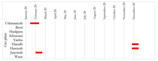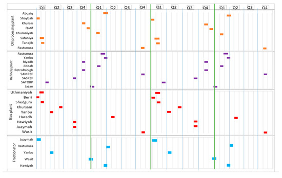 Maintenance schedule for all HCSC plants (maintenance model only); Color code: Orange: oil processing plants; Purple: Refinery plants; Red: Gas plants; Light Blue: Fractionator plants.