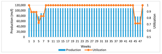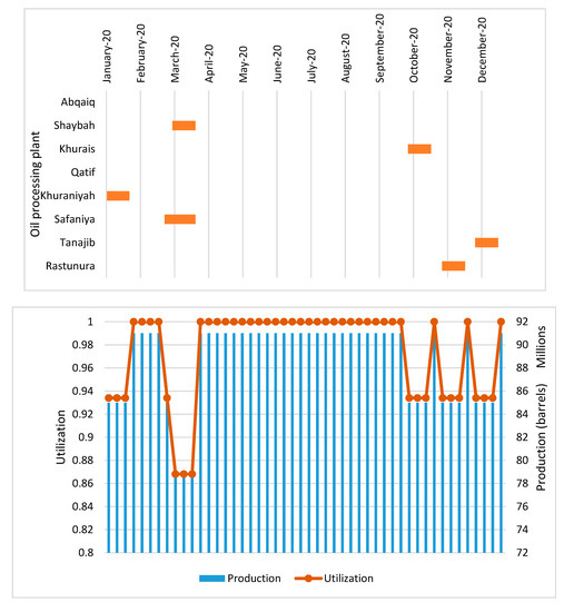 Similarly, Figure 6 shows the oil processing plants’ maintenance schedule, production, and utilization for the first year.