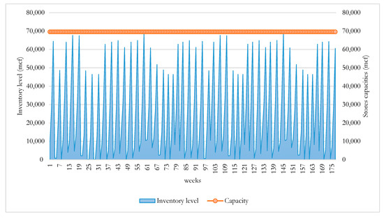 Figure 7 indicates the fractionation plant storage capacities and inventory levels fluctuations across the planning horizon. Production and maintenance are carried out on a weekly basis, while demand is on a monthly basis. As a result, the inventory level accumulated over the first four weeks of a month, then decreased as demand occurred at the end of the last week of a month.