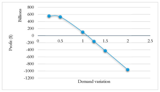 Figure 9 shows the fluctuations in profit with variability in demand. As demand increases, profit decreases because plant and storage capacities are kept constant; therefore, lost sales increase, which leads to customer dissatisfaction and ultimately lower profitability.