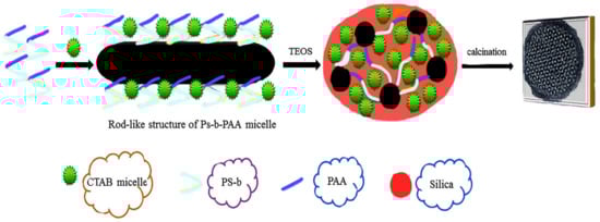 Synthesis of a silica mesopore using cetyltrimethylammonium bromide (C16H33N (CH3)3Br) (CTAB) and (polystyrene-b-poly (acrylic acid) (Ps-b-PAA) as amphiphilic.