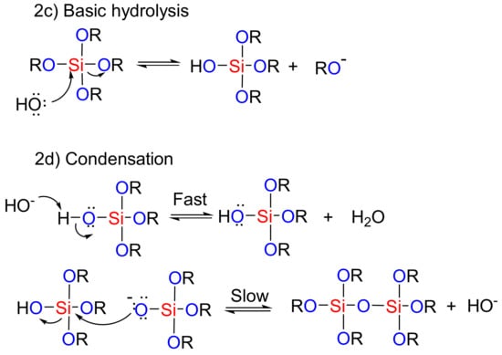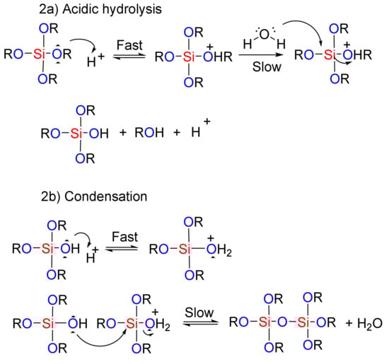 In the sol-gel method, hydrolysis and condensation processes are used to construct mesoporous nanostructures [89]. Organic compounds are integrated into the inorganic matrix of the mesoporous silica materials [90]. The presence of these organic compounds can then help in the formation of the final product through catalytic effects and improvements in the hydrolysis-condensation reactions. Depending on the nature and number of the organic groups that enter into the system, highly porous meso-structures can be achieved, even with heating [89]. The routes to the mesoporous nanostructure used by the sol-gel method under acidic and basic conditions are shown in Figure 2. In the first step, the acidic/basic silicate precursor is observed, which leads to the generation of a silanol group (creation of sol). In the next step, the silanols react together (condensation), and the gel structure is established by realizing the H2O or alcoholic by-products. A wet gel is obtained at this stage, which is ultimately converted into the original gel structure through drying and calcination process. In fact, under acidic conditions, the rate of nucleation determines the rate of the process. Due to the formation of a high concentration of the silanol groups, the final step is hydrolysis. Generally, hydrolysis in the presence of a base catalyst is faster than in an acid catalyst because the base prevents the agglomeration of the sol particles [91]. Therefore, hydrolysis and the condensation of silicate precursors can be considered as the key stage of the meso-structure’s preparation method [91]. McCormick et al. showed that a low concentration of an acid catalyst, in addition to being a self-inducing stimulus, is required to begin the reaction [92].