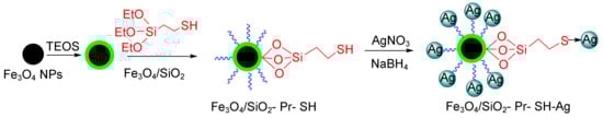 Mesoporous materials can be good candidates for this purpose because they have large surface areas, adjustable cavity sizes, and very high adsorption capacities [107]. The modification and functionalization of mesoporous materials via various functional groups, such as—NH2, COOH, and SH and their placement on active sites result in the easy removal of dye pollution [113]. Veisi et al. reported high catalytic activity on the part of magnetic silica nanoparticles in reducing the organic dyes 4-nitrophenol (4-NP), rhodamine B (RhB), and MB (Figure 3) [114].