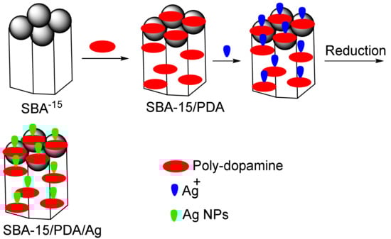 In another study, Song et al. reported on the synthesis of the SBA-15/polydopamine (PDA)/Ag nanocomposite [115]. They showed that the tested nanocomposite degraded 4-NP and MB without decreasing its catalytic activity (Figure 4). Ho et al., removed acid blue 25 and MB using modified MCM-41 with amine and carboxylic acid groups, respectively. Their results showed that there are base–acid interactions between these dyes and the modified mesopores with absorption capacities of 256 mg g−1 (acid blue 25) and 113 mg g−1 (MB) [115].