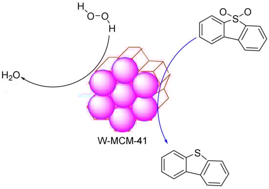 Zhang et al. synthesized tungsten-containing functionalized MCM-41 and employed it in the desulphurization reaction of dibenzothiophene (DBT). The results established that the mesoporous structures were well-preserved after the introduction of the tungsten species into the mesoporous materials [116]. These materials showed a good dispersion of the W species and formed an efficient and highly recyclable catalyst for the removal of dibenzothiophene (Figure 5). The characterization results showed that the mesoporous structure of MCM-41 was maintained after the introduction of the W species. These catalysts showed homogeneous dispersions of the W species in the mesoporous material and excellent catalytic activity in the removal of sulphur-containing compounds. The sulphur content in model oil can be reduced from 500 to 0 ppm with the low usage of an oxidant in 30 min. In the reaction, no organic solvents were added as extractants, and the mesoporous elements of W-MCM-41 acted not only as absorbents to absorb the sulphur-containing compounds but also as active sites to activate H2O2 to oxidize the sulphur compounds and convert them to sulphones. The oxidative reactivity of the sulphur-containing compounds decreased according to the following order: 4,6-DMDBT (4,6—dimethyldibenzothiophene) > DBT > BT (Benzothiophene) > DT (Dithiophene). In addition, it was possible to recycle the oxidation system nine times without a significant decrease in activity. Moreover, according to the GC–MS analysis of the oxidation products, a mechanism was proposed for the investigation of the absorptive oxidation process occurring between W-MCM-41 and sulphur-containing compounds [116].