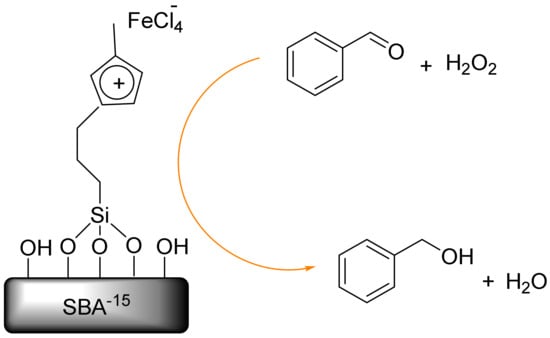 Also, Tuong et al. reported the solvent-free oxidation of benzyl alcohol to benzaldehyde by iron-chloride immobilized on SBA-15 (SIL-FeCl3) (Figure 6). The SIL-FeCl3 revealed higher catalytic activity in terms of the effective solvent-free oxidation of benzyl alcohol to benzaldehyde when using the oxidant. This mesoporous catalyst was easily recovered and reused without a significant loss in its activity and selectivity, leading to its potential application in an eco-friendly synthesis of chlorine-free benzaldehyde [117].