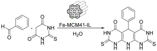 Additionally, an interesting catalyst of cylindrical Fe-MCM-41-ionic liquid (Fe-MCM-41-IL) was prepared by anchoring an acidic triazolium IL on the surface of Fe-loaded MCM. This cylindrical, mesoporous Fe-MCM-41-IL acted as an efficient, reusable, heterogeneous nanocatalyst for the one-pot synthesis of pyrimidine derivatives, producing high yields under mild conditions (Figure 12). Its operational simplicity, high yields, low cost, eco-friendly reaction conditions, reusability, and recoverability make this procedure much greener than the other reported procedures. Interestingly, this catalyst can be recovered via an external magnetic device [124].