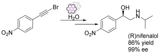 The facile synthesis of some multifunctional heterogeneous catalysts through Au/carbene assembly and a chiral Ru/diamine dual complex in mesoporous silica was reported by Xia et al. They also offered a synthetic approach for constructing a multi-functional mesoporous catalyst for an enantioselective tandem reaction. They demonstrated the one-pot enantioselective hydrogenation of a hydration–asymmetric transfer tandem reaction, creating chiral nifenalol with up to 99% enantioselectivity (Figure 13) [118].