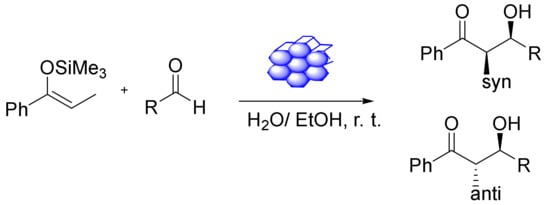 The XRD (X-ray diffraction) analysis of the iron-modified mesoporous silica showed there were no iron oxide species [125]. Moreover, FT-IR spectroscopy of the iron-modified mesoporous silica revealed a significant majority on the LA site compared to the Bronsted site. The iron species deposited on mesoporous silica can function as highly selective and active sites for the Mukaiyama aldol reaction of various aldehydes with phenyl-1-(trimethylsiloxy)-propene and trimethylsilyloxycyclohexene. The experimental procedure using a clean solvent system was straightforward, and no harmful organic solvents were used. The catalyst could be recovered and used once again the same reaction without loss in activity. The iron-modified mesoporous silica nanocatalyst is an extremely active heterogeneous LA catalyst and could be applied in many other reactions and numerous environmentally friendly chemical transformations in organic chemistry.