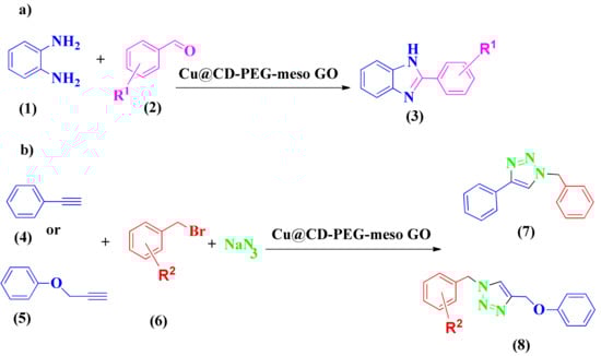 Khalili et al. reported cyclization reactions through a copper-based catalyst, i.e., Cu@βCD (β-cyclodextrin) PEG-meso-GO NPs [140]. The hydrophilic and waterproof characteristics of NPs are provided by PEG. In addition, β-CD can be used as an efficient ligand for the Cu catalyst and help the phase transfer into the aqueous phase [141,142,143,144]. Copper species play critical roles in the cycloaddition reaction needed to synthesize 1,2,3-triazole and the click and oxidation reactions necessary for synthesizing benzimidazole derivatives (Scheme 2a,b, respectively). The activity and efficiency of Cu@βCD-PEG-meso-GO NPs as a catalyst was estimated for the click reaction and C-N bond oxidation. It was shown to be a water tolerance, efficient, and recyclable catalyst [145,146,147,148]. The benefits of these green procedures (water was used as a solvent) were their high-yield reactions at short reaction times without laborious purification, plus the catalyst was easily recoverable and water dispersible. These NPs exhibited good reusability without significant decreases in activity.