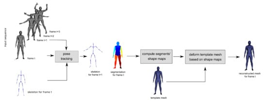 - A template mesh skinned to the animation skeleton for the first frame (we used automatic weights generated by the Heat Bone Weighting method [49] implemented in Blender).