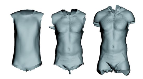 - Anguelov, D.; Srinivasan, P.; Koller, D.; Thrun, S.; Rodgers, J.; Davis, J. SCAPE: Shape Completion and Animation of People. ACM Trans. Graph. 2005, 24, 408–416. [Google Scholar] [CrossRef]