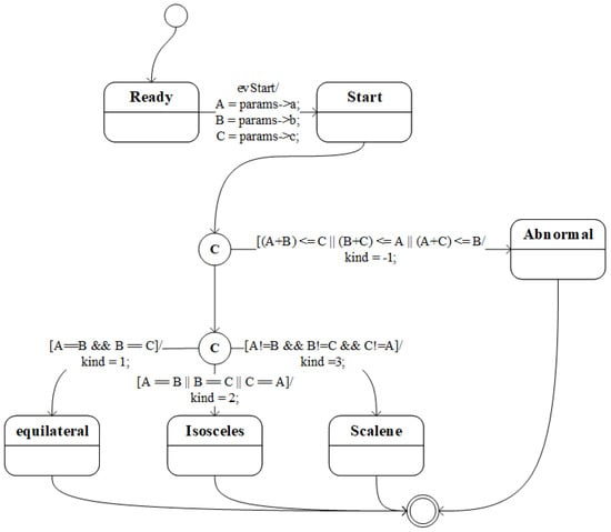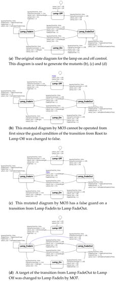 In typical model-based mutation testing, mutations for the software model or specific diagrams are used to design robust test cases or optimize test cases. Bernhard K. Aichernig, the most active researcher of model-based mutation testing, studied how to perform test case selection on mealy machines using active automata learning techniques for conformance testing []. He also proposed a method to generate test cases in a block-box environment based on mutation testing in the model, such as statecharts, class diagrams, and instances diagrams []. Fevzi Belli et al. performed a test for fault detection at the system level from event sequence graphs, finite-state machines, and statecharts [].