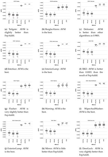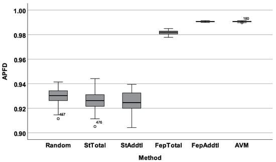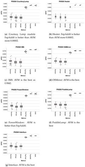The PWS module featured seven principal submodules in Table 4 and 86 state machines. The test cases generated were proportional to the numbers of mutants, and test cases exhibiting various paths were generated within the state chart even if the module size was small. Thus, similar numbers of test cases were generated for the heater and other more complex functions; the heater submodule is very small. APFD served to measure the fitness of TCP; the outcomes of various prioritization methods were compared. We first confirmed that the data were normally distributed. For each TCP method, the mutation operator created 100 mutants and test cases were then generated automatically. The results (100 for each method) were analyzed as described in Table 5. We confirmed that the APFD values became essentially normally distributed as the test numbers rose; we used ANOVA to explore the statistical significances of APFD differences. We also employed the Duncan post-hoc test; the p-value was <0.005 and was correlated among the groups. When the Scheffe test (which is stricter than the Duncan test) was applied, the results of the Random, StTotal, StAddtl, and FepTotal methods differed significantly. However, the StTotal and StAddtl, and FepAddtl and AVM methods sometimes did not differ significantly (depending on the submodule). A boxplot of the average APFD comparisons follows.