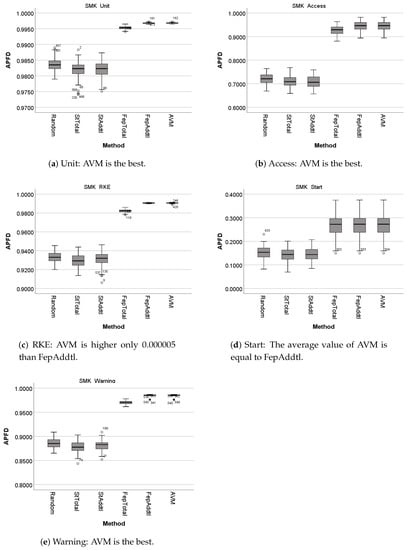 First, when comparing the FepAddtl and AVM results for the Unit submodule in the upper left panel of Figure 6, it is clear that the AVM result was best (about 0.0002). For the Access module (upper right panel), the AVM and FepAddtl results were 0.94408 and 0.9446. The state diagram of the Start submodule features sub-states and sub-state diagrams, and is complicated; the APFD is lower than that for other submodules. It was difficult to create test cases that killed mutants on mutation testing. Thus, the APFDs of the FepTotal, FepAddtl, and AVM test suites were similar. For the Warning submodule, the average APFD differences between AVM and the other methods were less than 0.00015 and, thus, negligible. In terms of overall prioritization, Random, StTotal, and StAddtl did not yield good results in most cases compared to the other methods. Commonly, the APFD results of AVM were clearly superior to those of FepTotal, and similar to those of FepAddtl. However, as for the PWS (Section 5.1), the Scheffe post-hoc test revealed no significant difference between FepAddtl and AVM. The difference between FepTotal, on the one hand, and FepAddtl and AVM, on the other, was significant when the APFD test suite values exceeded 0.9.