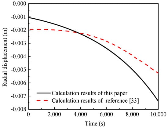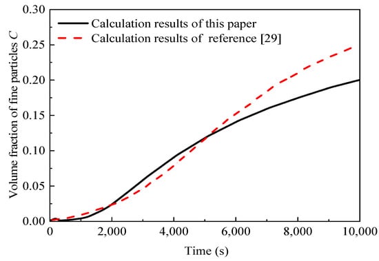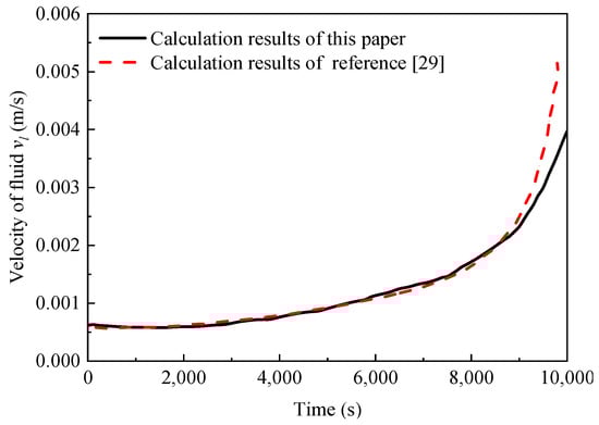 The evolution curves of volume fraction of fine particles, porosity, velocity of fluid, and radial displacement at the inner boundary calculated according to the mathematical model in this paper are shown in Figure 4, Figure 5, Figure 6 and Figure 7 respectively, and the calculation results in this paper are compared with those in reference [33]. A comprehensive analysis of Figure 4, Figure 5, Figure 6 and Figure 7 shows that the evolution curves of volume fraction of fine particles, porosity, velocity of fluid, and radial displacement calculated by the mathematical model established in this paper are consistent to the results in reference [33]. Because of the difference between the porosity evolution equation, the permeability equation in this paper, and those in reference [33], there is a certain error between the calculation results and those in reference [33]. However, the error is within the acceptable range. This also verifies the correctness of the model in this paper.