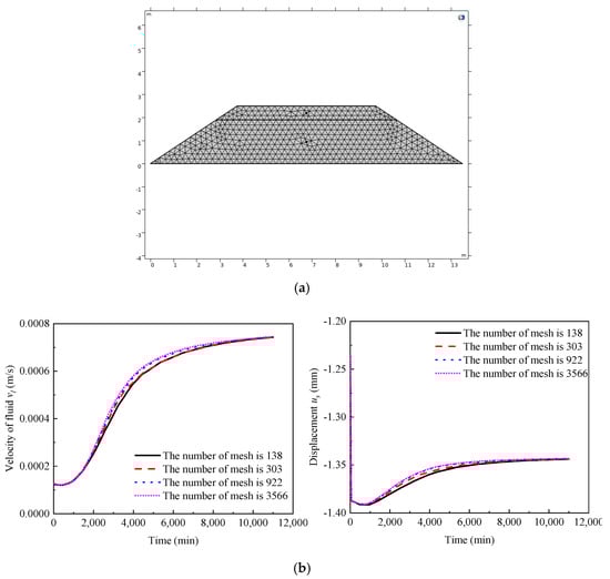 The above mathematical model was solved by using the coupling solid mechanics module and porous medium multiphase flow module in the software COMSOL Multiphysics®. Taking the volume fraction of fine particles (), the pore pressure of the fluid (), and the displacement of the solid skeleton () as the basic unknowns, the other unknowns such as the velocity vector of the fluid , the velocity vector of the fine particles (), the mass rate of fine particles migration (), the porosity (), and the permeability ()can be calculated by the basic unknowns.