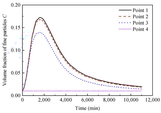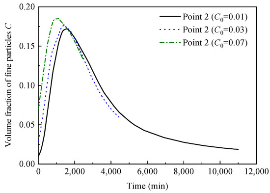 Figure 17 shows the evolution curves of the volume fractions of fine particles with different initial fine particles volume fraction at point 2. From Figure 17, we know that the larger the initial fine particles volume fraction is, the larger the maximum value of fine particles volume fraction is, and the shorter the time needed to reach the maximum value. Combined with Equation (20), the larger the initial fine particles volume fraction is, the larger the mass rate of fine particles migration will be; therefore, the shorter the time needed to reach the maximum fine particles volume fractions will be. It can be concluded that the fine particles content in the filler of subgrade should be strictly controlled, and the fine particles content should be reduced as far as possible on the premise that the filler grade meets the requirements of the specification in practical engineering.