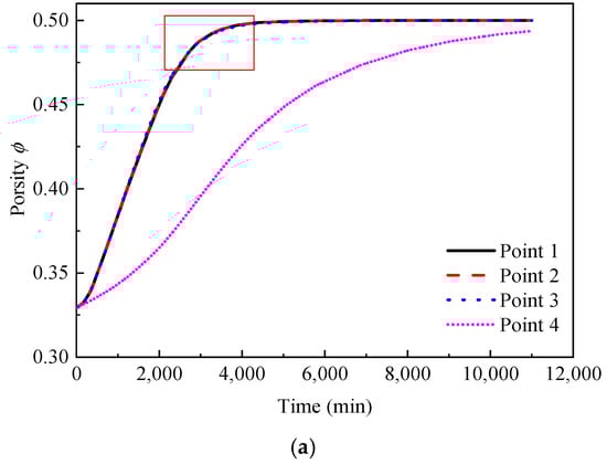 where: is the maximum porosity, which refers to the limit value of porosity change in porous media caused by the migration of fine particles; is the critical volume fraction of fine particles when the migration reaches equilibrium; is the modulus of the velocity vector of the fluid (); is the erosion coefficient of fine particles ().