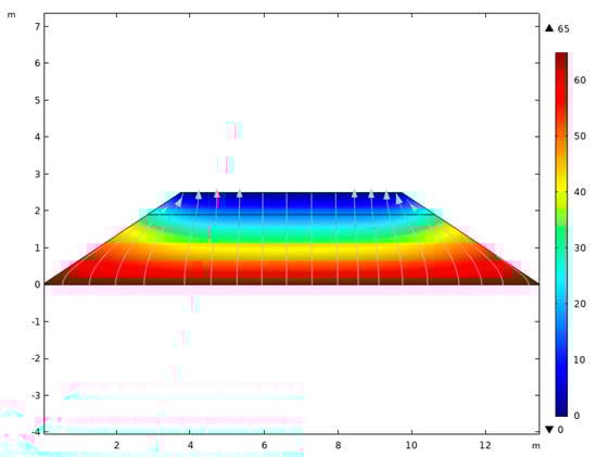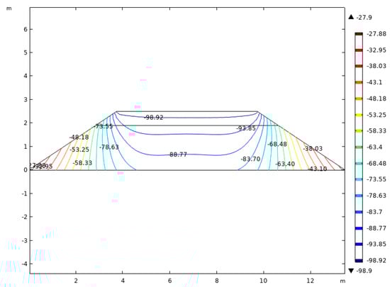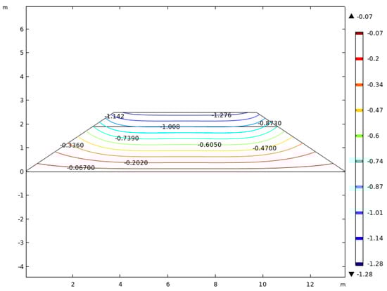 Figure 20 shows the contours of vertical displacement at the steady state of fluid seepage. We can see that the vertical displacement is distributed symmetrically on the central axis of the subgrade. At the same depth, the vertical displacement at the central axis of the subgrade is slightly larger than the vertical displacement at the edge of the subgrade.
