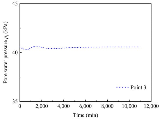 - With the increase of time, the pore water pressure at point 3 shows a trend of first decreasing, then increasing, and then decreasing, and finally remains stable, but the range of its increase or decrease is small. This reason is that with the erosion and migration of fine particles in the subgrade, the porosity and permeability of each point inside the subgrade are different (see Figure 10 and Figure 14 for details), thus affecting the distribution of pore water pressure. Therefore, the pore water pressure at the same point is not constant.