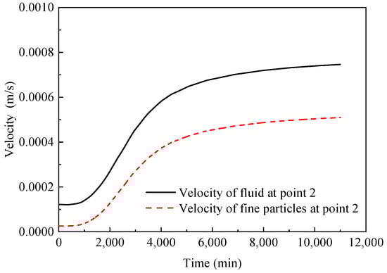 Figure 14. Evolution curves of velocity of fluid and fine particles in saturated zone of railway subgrade.