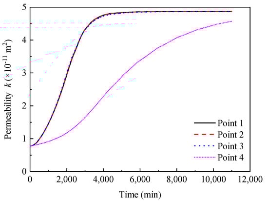 Figure 16 shows the evolution curves of permeability in saturated zone of railway subgrade. It can be seen from Figure 16 that the permeability increases rapidly to the maximum after a relatively slow growth, and finally remains stable. For observation points 1~3, the maximum permeability is about 4.9 × 10−11 m2, which is an increase of about 6.3 times higher than the initial permeability.
