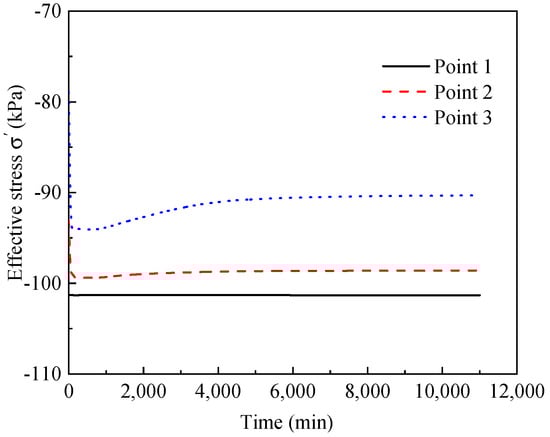 Figure 18 shows the contours of vertical effective stress at the steady state of fluid seepage. Figure 19 shows the evolution curves of vertical effective stress at different observation points in saturated zone of railway subgrade. It can be seen from Figure 18 that the vertical effective stress is distributed symmetrically on the central axis of the subgrade. With the increase of depth, the vertical effective stress decreases. It can be seen from Figure 19 that vertical effective stress at points 2 and points 3 increases first and then decreases slightly with the increase of time, and finally tends to be stable. In combination with Figure 13, the pore water pressure increases at a time of about 1000–2000 min, so the effective stress decreases.