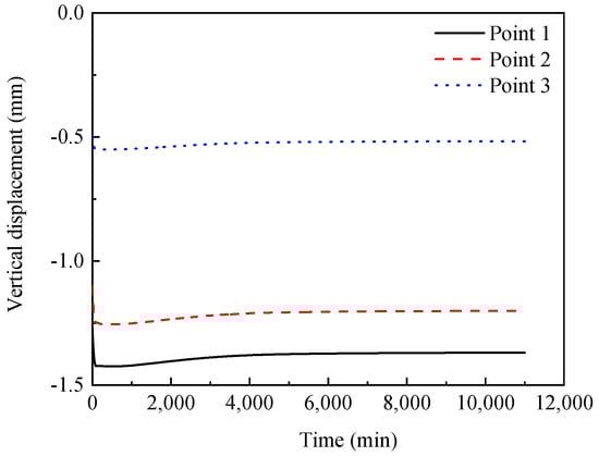 - The vertical displacement is distributed symmetrically on the central axis of the subgrade. With the increase of time, the vertical displacement increases first and then decreases slightly and finally tends to be stable.