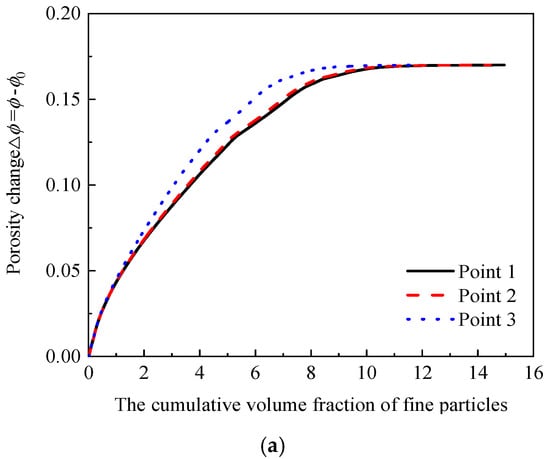 Figure 22a shows the relation curves of porosity change and accumulative volume fraction of fine particles and (b) shows the relation curves of porosity change and vertical displacement. The positive value of porosity change represents the increase of porosity, and the negative value of porosity change represents the decrease of porosity. It can be seen from Figure 22 that the accumulative volume fraction of fine particles has a significant impact on the change of porosity: with the increase of the accumulation volume fraction of fine particles, porosity change increases gradually, when the accumulation volume fraction of fine particles reaches about 10, the porosity change reaches a plateau value. The vertical displacement has little influence on the change of porosity. With the change of vertical displacement, the porosity first decreases slightly and then increases slightly, and finally remains stable.