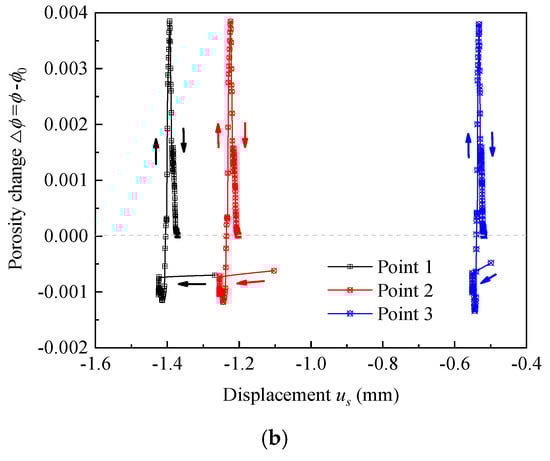 (a) The relation curves of porosity change and cumulative volume fraction of fine particles; (b) the relation curves of porosity change and vertical displacement.