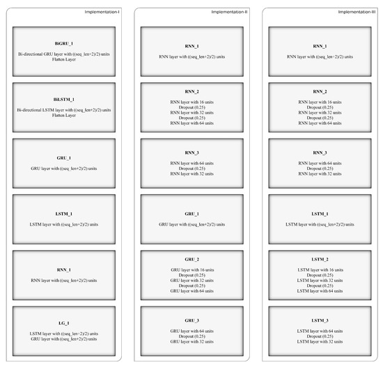 Similar to implementation 2, six base learners (RNN_1, RNN_2, RNN_3, LSTM_1, LSTM_2, and LSTM_3) are employed in implementation 3. The hyperparameters have been set similarly.