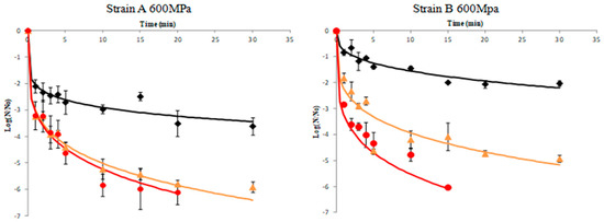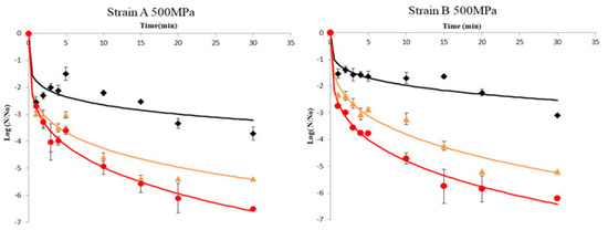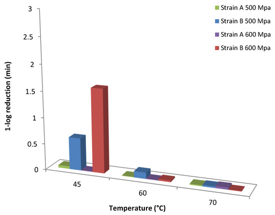 Comparing the two strains, it can be underlined that the wild-type strain A was less resistant to high-pressure treatment compared to the reference strain B at all temperatures assayed (45 and 60 °C) with the exception of 70 °C where stain A was proved more resistant (Figure 1 and Figure 2).
