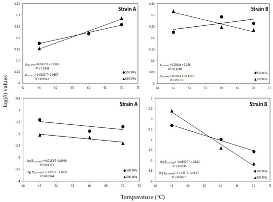The data points were fitted with a linear function as shown in Figure 3 providing information on the temperature sensitivity of δ values for a given high pressure level. Thus, for the wild strain A the z values were 76 and 74 °C for HPP treatment at 500 and 600 MPa, respectively, indicating that temperature changes have minor effect on δ values for this strain. However, the respective z values for strain B were 20 and 10 °C for the same pressurization levels, indicating a larger effect of temperature changes on δ values for this strain of the bacterium. The results obtained in this work for the z values of the reference strain B are comparable with previous researchers [5] who reported z values between 20.07 and 21.43 °C for A. acidoterrestris spore inactivation at 600 MPa combined with mild heat in malt extract broth adjusted to 10, 20 and 30 °Brix. In another work [18], a z value of 34.4 °C was reported for spore inactivation of A. acidoterrestris in orange juice during HPP processing at 600 MPa in the temperature range of 45–65 °C.