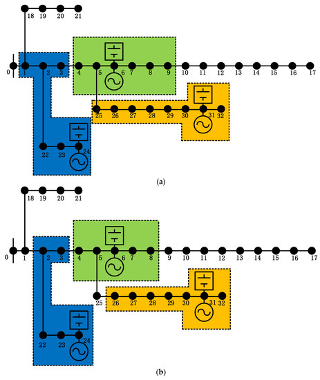 On the basis of the above input conditions, the wind turbine, photovoltaic generator and energy storage are configured in the IEEE-33 bus standard system. When a failure occurs, the microgrid operates considering the fixed boundary in scheme 1, and the dynamic boundary in scheme 2. The results of scheme 1 considering the fixed boundary island division are shown in Figure 2a and the results of scheme 2 considering the dynamic boundary island division are shown in Figure 2b. In the fixed boundary island division, the wind turbine, photovoltaic generator and energy storage are located at nodes 6, 24 and 31, respectively; in the dynamic boundary island division, the wind turbine, photovoltaic generator and energy storage are located at nodes 6, 24 and 31, respectively. The configuration positions of the wind turbine, photovoltaic generator and energy storage considering the fixed boundary are the same as when considering the dynamic boundary. The local consumption of active power to reduce the network loss is considered, therefore the wind/solar/storage should be configured in the node with the concentrated load. The influence of the boundary on the reliability and comprehensive benefits of the system mainly lies in the difference of the load power supply guaranteed by dividing the island when an operation failure occurs. Therefore, in terms of long-term scale, to ensure the comprehensive benefits of the system, the configuration positions of the wind turbine, photovoltaic generator and energy storage should be in the load concentration area, no matter whether they are the fixed boundary island division or the dynamic boundary island division.