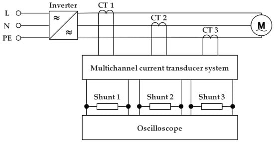 The measurement of electrical values is designed in such a way that only one pump can be measured at a single time. With the help of the power analyzer Yokogawa PX8000 ⑪ the one-phase input values (U, I, power factor) of the pump are measured. To record the motor values, the pump lines were led to the outside. The processing of the signals takes place with the help of the following measuring set-up, whereby Figure 3 shows a representation of the electrical plan. The motor current induces an equivalent voltage signal in the current transformer ⑫ (LEM IT 400-S). This signal is passed on to a current transformer system ⑬ (Signaltec MCTS), whose internal power supplies are galvanically isolated from each other as well as from ground potential. On the one hand, this system increases the range of the measuring signal and on the other hand, both external and internal disturbances are reduced. The current output signal is then converted into an equivalent voltage signal via shunts (Yokogawa 19/SH5/BNC/0.05) for acquisition on the oscilloscope ⑭ (Rhode and Schwarz RTE 1034).