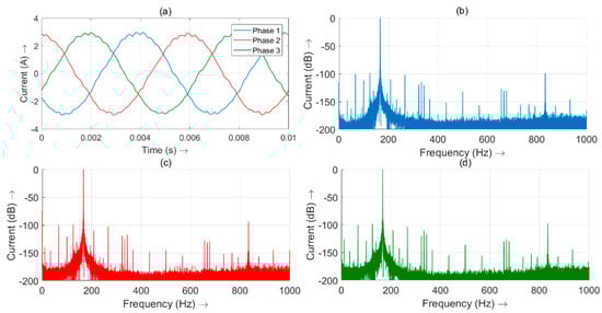 Signals of a healthy pump at a speed of 2500 rpm: (a) Time-domain signal of the motor currents 1, 2 and 3 (b) motor current signature analysis (MCSA) of Phase 1 (c) MCSA of Phase 2 (d) MCSA of Phase 3.