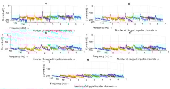 MCSA of a pump with different number of clogged impeller channels at a speed of 2500 rpm: (a) around fr,pump− = 125.0 Hz. (b) Around fr,pump+ = 208.4 Hz. (c) Around 791.9 Hz. (d) Around 875.3 Hz. (e) Around fBPF = 58.4 Hz.