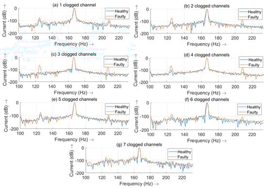 MCSA of a pump with a different number of clogged impeller channels at a speed of 2500 rpm and corresponding healthy variant with the same power consumption: (a–g) 1–7 clogged channels.