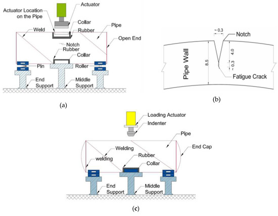 Very few full-scale experimental studies on dent-crack defects in pipelines have been accomplished [2,3,4,5], mainly because of the difficulty in creating artificial cracks for experiments. Usually, the cracks are represented by notches and gouges [9] with a small fatigue crack at the tip. Currently, there are no analytical models for assessing the integrity of a pipeline with dent-crack defects. The pipeline defect assessment manual [10,11] recommends the use of dent-gouge fracture models to assess dent-crack, without taking the difference between the stress environments at the tip of cracks and gouges into consideration.