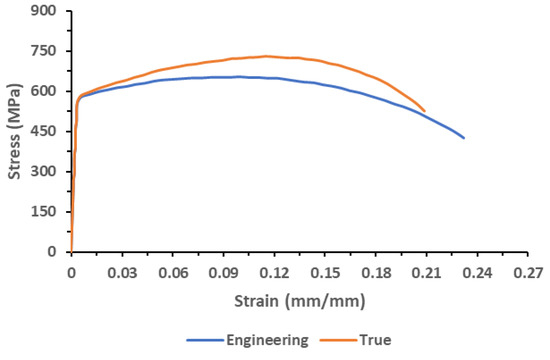 Samples extracted from the pipe in accordance with procedures of the American Society for Testing and Materials, standard E8 (ASTM E8) were used in tensile tests. The material had a yield stress of 540 MPa (5% proof strain), tensile strength of 620 MPa, Young’s modulus E of 204 GPa, and Poisson’s ratio v of 0.3. Figure 2 shows the stress-strain curve of the pipe material. Charpy-V notch impact tests of five sub-size samples (full wall thickness in specimen sizes) taken from the pipe showed that the pipe material was sufficiently ductile. The material was reported to present a fully ductile fracture behavior, with approximate Charpy impact energy of 152 J at room temperature.