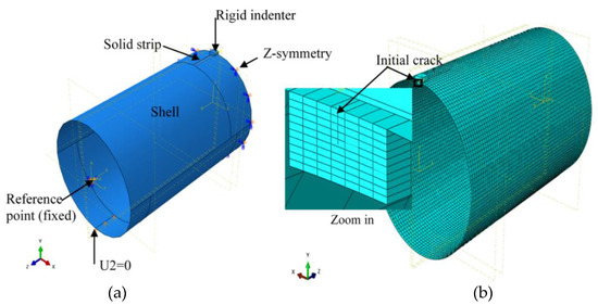 Figure 3a shows the setup of the model and the boundary conditions. Symmetry of the burst test set up along the z-axis (along pipe length) was used to model half of the pipe and reduce computational cost. The model comprised of a deformable solid strip of length 250 mm, width 20 mm, and thickness 8.5 mm, a deformable shell of OD 762 mm and length 1250 mm, with part of it cut out and replaced with the solid strip in which the crack was embedded. Shell geometry was defined by the top surface such that the pipe was assembled by joining the top edge of the shell to the top edge of the solid strip. Previous studies [19] show that shell elements work best when the section is offset at mid surface. The predictions are closer to predictions made using a fully solid model. But the analysis time is significantly longer than the time taken when shell geometry was offset at the top surface. Predictions with shell section offset at the top surface were within 10% of the solid model predictions and yet the analysis time was at least 4 times faster. Shell-solid coupling constraint was used for the transition between solid and shell elements in the pipe body. The crack was modelled as a rectangular planar shell embedded in the solid strip, while the indenter was modelled as a discrete rigid solid block placed at the 12 O’clock position of the pipe and over the crack. Surface-to-surface standard contact was prescribed between the pipe and the indenter. Z-symmetry boundary condition was applied along the circumferential edge of the pipe for symmetry along the z-axis. Vertical support was provided at the bottom of the pipe by restraining degree of freedom U2 against vertical displacement at locations on the pipe surface that were placed on steel blocks during the burst test. Kinematic constraint was used at the ends of the pipe with the geometric centers as reference points, fixed against displacement and rotation but allowing the pipe to freely expand.