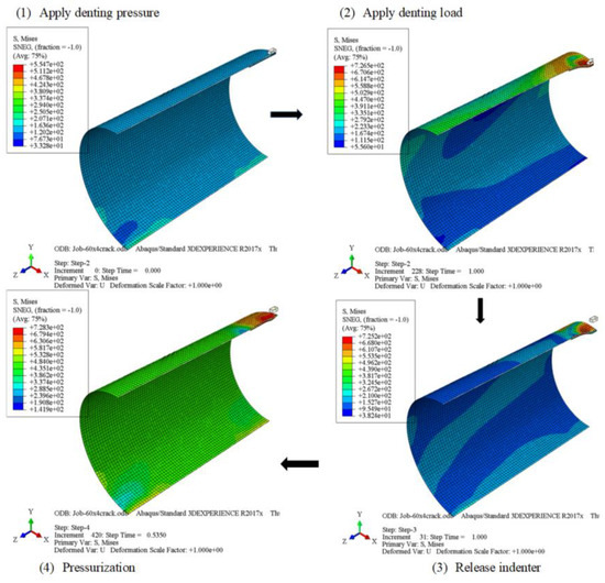 Showing typical distribution of von Mises stress in the pipe at different loading steps followed in this study; Step 1: Apply denting pressure; Step 2: Dent the pipe; Step 3: Release the indenter from pipe surface; Step 4: Pressurize the pipe to propagate crack and burst the pipe.