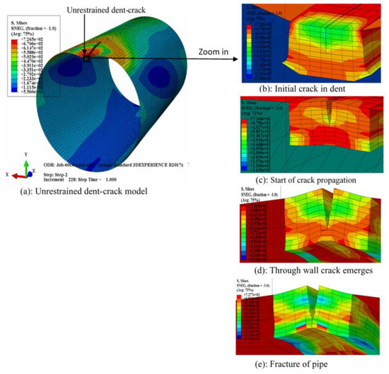 Distribution of von Mises stress in pipe wall at various stages of propagation of a crack inside unrestrained dent: (a) Model of pipe with unrestrained concentric dent-crack; (b) Before applying pressure; (c) At start of crack propagation; (d) After through wall crack emerges inside pipe; (e) When crack has fully opened and fracture is complete.