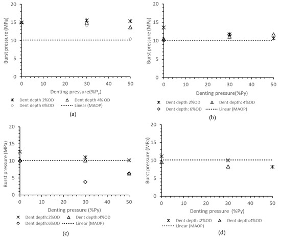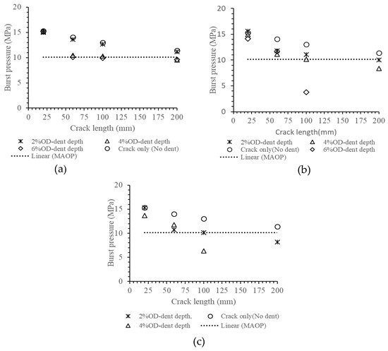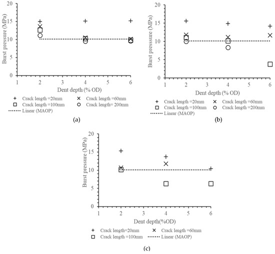 Increasing the dent depth from 0% to 6% OD while keeping the crack length and the crack depth constant did not change the burst pressure if the dent was formed at zero pressure (Figure 8a). But, where denting of the pipe was accomplished with the pipe already under pressure, increasing the dent depths at constant crack length and crack depth reduced the burst pressure, as shown in Figure 8b,c. The rate of drop in the burst pressure with dent depth increased with crack length and denting pressure.