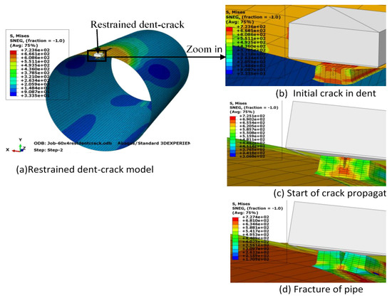 Distribution of von Mises stress in pipe wall at various stages of propagation of a crack inside a restrained dent: (a) Model of pipe with restrained dent-crack; (b) Before applying pressure; (c) At start of crack propagation; (d) After fracture is complete.